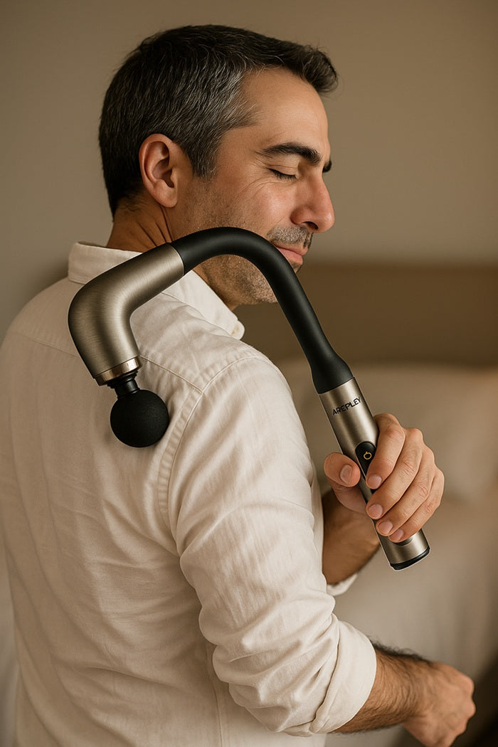 Toma tu ArcFlex™, enciéndela y desliza suavemente el cabezal sobre la zona tensa. Siente cómo las micro-percusiones penetran profundamente, aumentando la circulación y calmando los nervios. En segundos, la rigidez comienza a ceder.